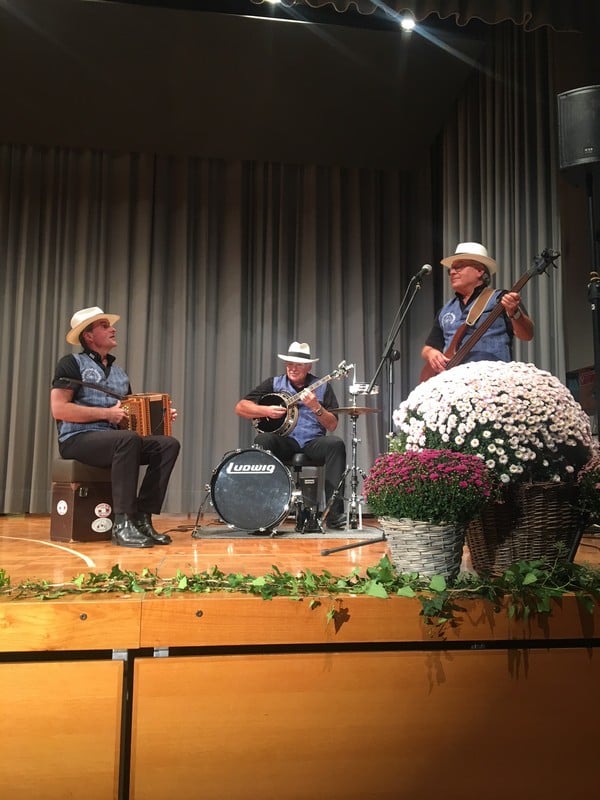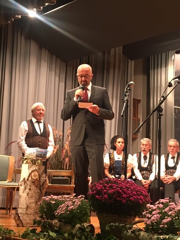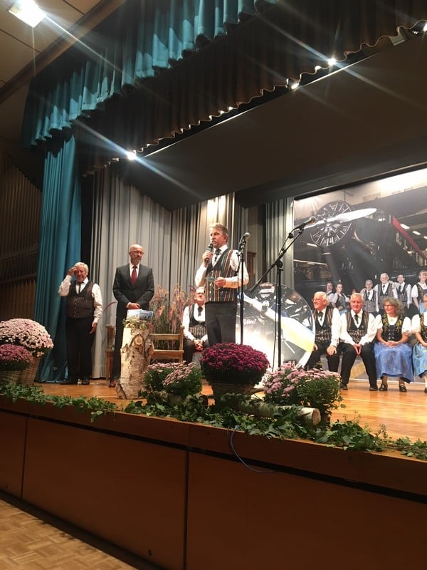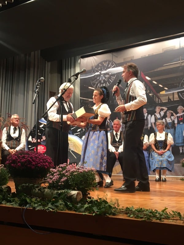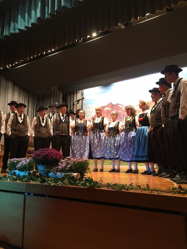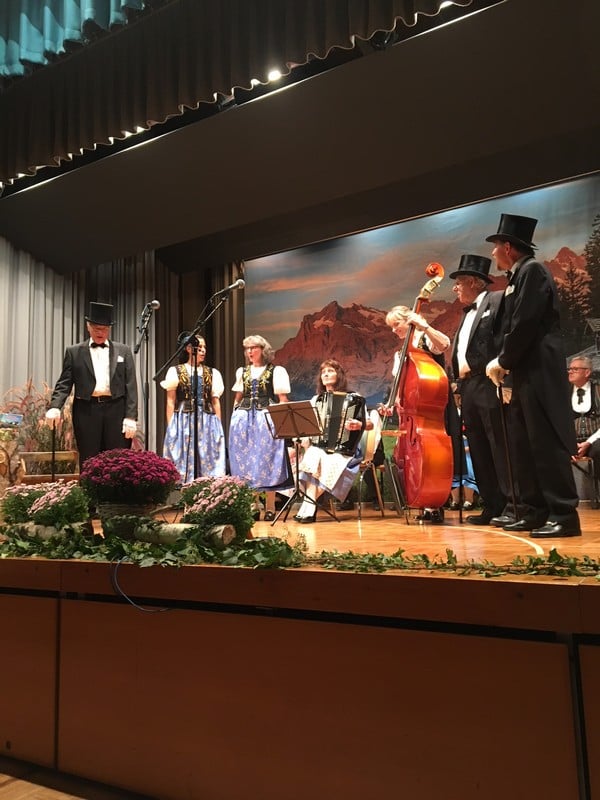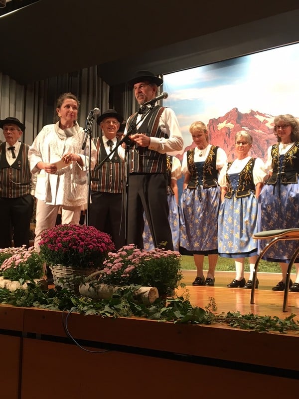 Es war ein sehr gemütlicher und lustiger Abend im ReZ in Dübendorf. Das saalfüllende Publikum wurde vom Jodelclub Schwyzerhüsli mit einer Nebelwolke und dem Nebelmeer Juitz von André von Moos begrüsst. Danach wechselten sie sich mit dem Gastklub, dem Jodlerklub Sarnen unter der Leitung von André von Moos ab. Das wunderbare gesangliche Program wurde musikalisch von den Background Gamblers eingerahmt. Ein Highlight des Abends war natürlich noch die CD Taufe des Tonträgers JUtze JUhee vom Jodelclub Schwyzerhüsli. Nach einer Ansprache von Stadtpräsident André Ingold, welcher das Göttiamt für die CD übernommen hat, wurde die CD feierlich von Alex Eugster getauft. Zum Amusement der Gäste landete ein Teil des Wassers ganz unerwartet auf Stefans Kopf:-) Es folgten noch mehr schöne Jodelklänge und zum Schluss durften alle die singen wollten auf die Bühne zum Gesamtchor. André von Moos dirigierte zu diesem Anlass den Steimanndli Jutz, welcher aus seiner Feder stammt und als Zugabe noch den Geburtstagsjutz.